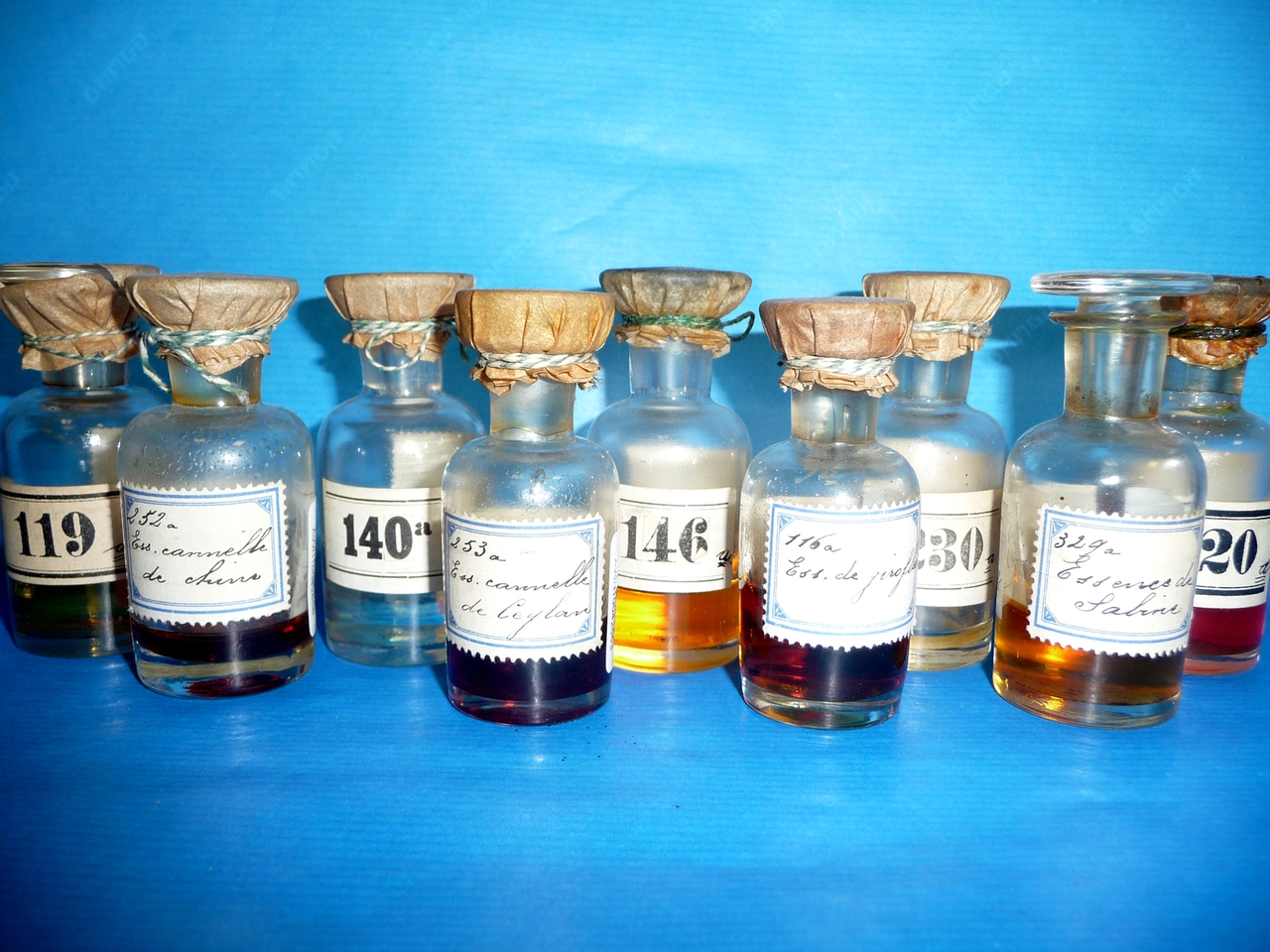 Stored in fine glassware, this historic collection is a delight to the eye. It also offers the forgotten raw materials on a tray for further innovative research.
