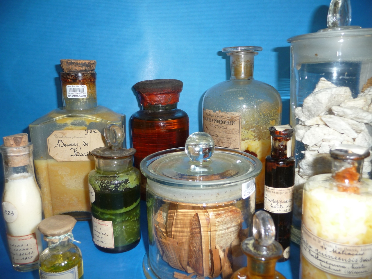 | Essential oils | Eye-catchers from the drug collection of the past including green bay oil, square-packed nutmeg butter and white lumps of illipé, showing the rich variety of fats in firmness, formulation, colour and container |