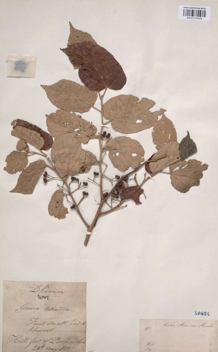 | Hibiscus sp. “The root used in preparing a white dye. In medicine as aphrodisiac”. Pune | Grewia asiatica. “Fruit small, acid and pleasant”. The fruit is commercialised under the name falsa (or phalsa). Hill fort of Purandar. |