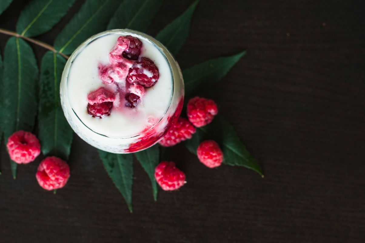 Panna cotta aux framboises et gelée d'argousier.