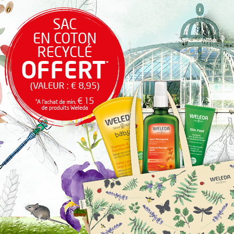 Du 14 mars au 3 avril, vous recevrez un magnifique cabas en coton (recyclé) en cadeau lorsque vous achetez* des produits Weleda dans la Boutique du Jardin ! Grâce à votre achat, vous recevrez non seulement des produits de soins 100% naturels, mais vous soutiendrez également la biodiversité ainsi que le développement et l'entretien de notre jardin culinaire.