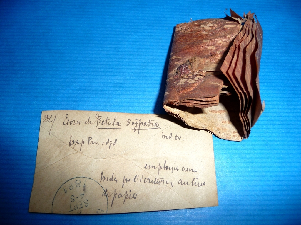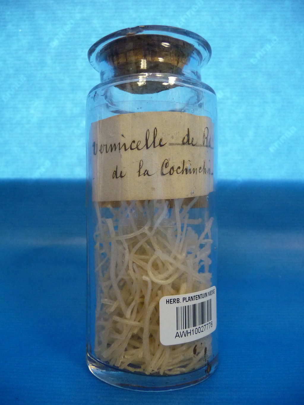 | Flinterdunne bast van “Betula bhojpattra”, in India gebruikt als schrijfpapier | Rijstvermicelli uit Cochinchina |
