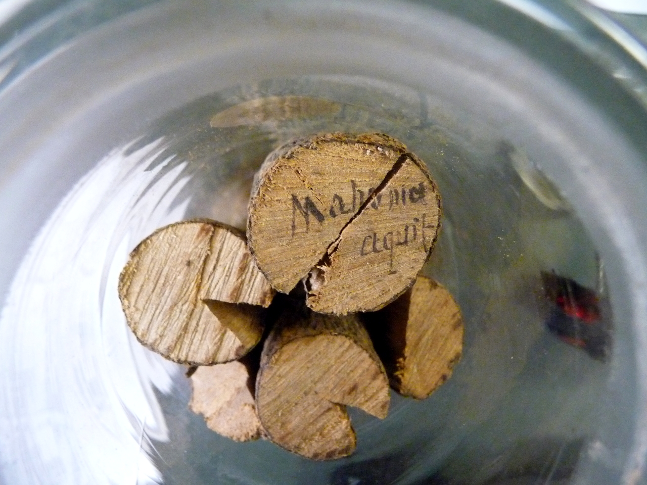 | Houtstaal van de mahoniestruik (Mahonia aquifolium) met soortnaam op dwarsdoorsnede | Publicatie gesigneerd voor François Crépin |