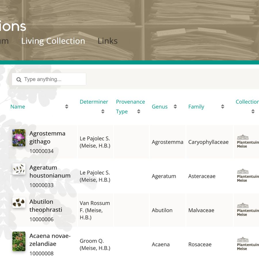 Naast informatie van levende planten presenteert botanicalcollections.be ook beelden samen met etiketgegevens van bijna 3 miljoen herbariumspecimens, een werk in uitvoering dat ook de verschillende herbaria van het land op één platform wil samenbrengen. V.B.T.A., De Vereniging van Botanische Tuinen en Arboreta van ons land is dan ook trots op deze realisatie die tot stand kwam met de steun van het FWO (Fonds Wetenschappelijk Onderzoek – Vlaanderen) binnen het project DiSSCo-Flanders (Distributed System of Scientific Collections). Dit project kadert in de internationale trend om belangrijke en goed gedocumenteerde gegevens ter beschikking te stellen van iedereen die er baat bij heeft.