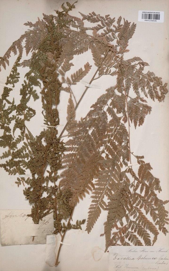 De planten in de Van Heurck-collectie, waaronder een mooi type-exemplaar van Davallia trapeziformis Roxb., komen van Saparua (Honimoa op de labels), Ambon (Amboyna), Nusa Laut (Nussalaut), Banda en Malacca.
