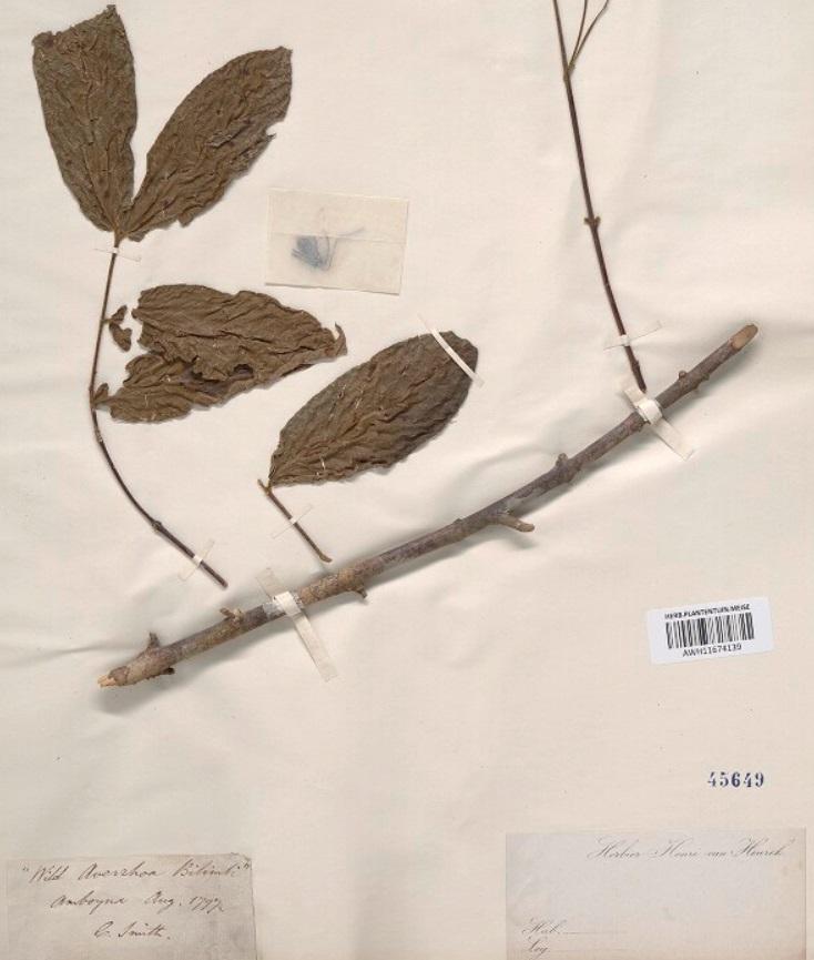 | Herbariumexemplaar van de wilde vorm van blimbing (Averrhoa bilimbi L.). | “Wilde Averrhoa bilimbi”, Amboyna, augustus 1797. C. Smith. |