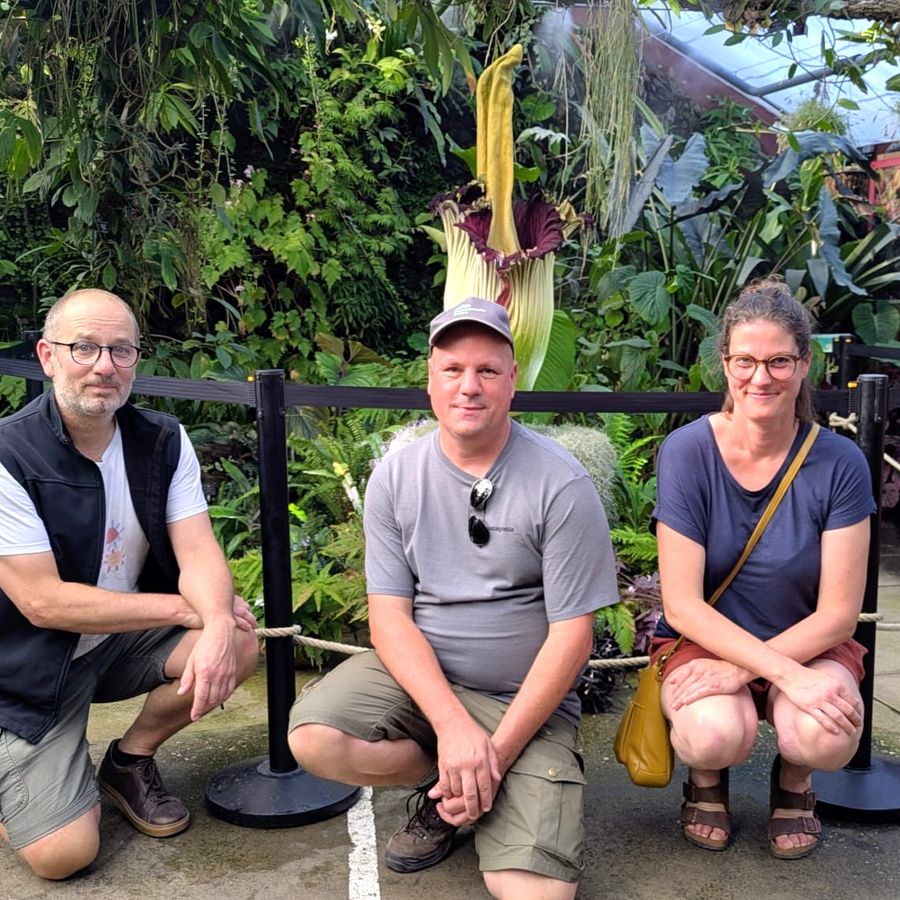 Drie medewerkers van Plantentuin Meise (van rechts naar links op de foto): Sarah Le Pajolec, Stijn Stappaerts, en Olivier Maurin, allen specialisten en liefhebbers van deze plantenfamilie, waren bij dit bijzondere moment aanwezig. En dit was geen toeval: ze namen deel aan de jaarlijkse bijeenkomst van de European Aroid Society, die dit jaar werd georganiseerd door de Jean-Marie-Pelt botanische tuin. Een perfect moment om de bloei van een exemplaar te bewonderen dat ze goed kenden.