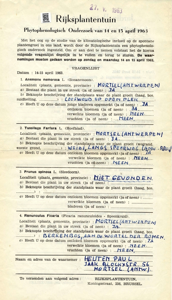 Tussen 1952 en 1965 noteerden burgers jaarlijks tijdens het eerste weekend van april de groeistadia van vroege voorjaarsbloeiers in België, Noord-Frankrijk, Luxemburg en Nederland. Meer dan 8.000 historische fiches vormen vandaag een unieke bron voor klimaatonderzoek.