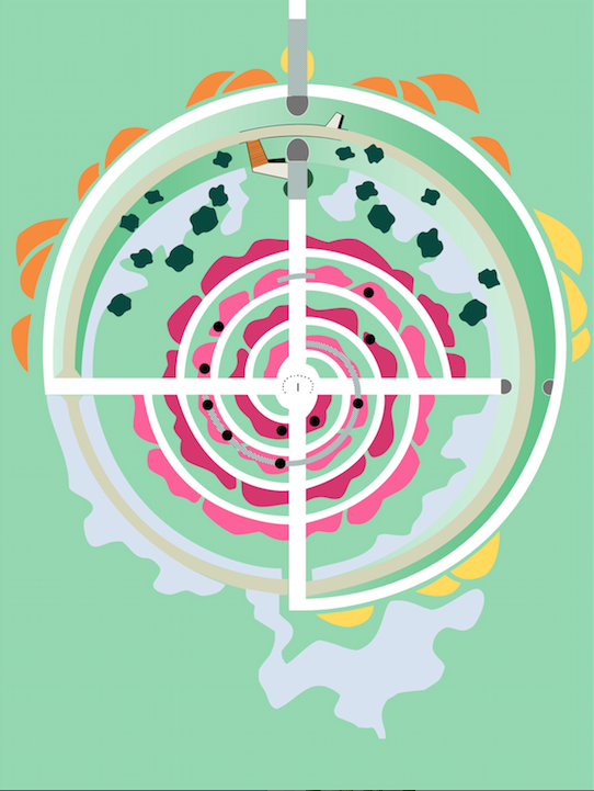 Twee spiralen vormen het hart van de 9000 m2 grote rozentuin. In het centrum van het hart bevindt zich een horizontale zonnewijzer, waarbij de bezoeker zelf de plaats van de wijzer moet innemen door op de juiste maand te gaan staan.