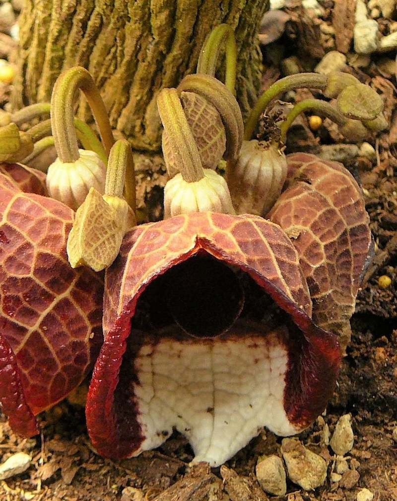De reuzenpijpbloem, Aristolochia gigantea, is een tropische plant uit Brazilië. Ze wordt pelikaanbloem of ook ‘Brazilian Dutchman’s pipe’ genoemd, verwijzend naar de gekromde pijpvorm van de bloem. Het is een altijdgroene, snelgroeiende klimplant met grote hartvormige bladeren. De bloem kan 60 cm lang worden en omvat een gekromde buis met grote fluweelachtige, donkerrood-paars gekleurde bloembladen. Ze verspreidt een bijzondere geur, kleine insecten volgen het bedwelmende geurspoor en komen terecht in de smalle bloembuis. Het is een insectenval met éénrichtingsverkeer naar het diepste hart van de bloem, waar de insecten tijdelijk worden opgesloten. Na bestuiving van de bloem opent de val en de insecten, deze keer met nieuw stuifmeel beladen, vertrekken naar een volgende onweerstaanbaar ruikende reuzenpijpbloem. Ook de familie van de aronskelken ‘vangt’ insecten die alleen kunnen ontsnappen na bestuiving. Aristolochia arborea is een bijzondere pijpbloem uit het regenwoud van Centraal-Amerika. Ze groeit aan de voet van bomen en imiteert op het bloemblad een paddenstoel mét geur ter misleiding van een specifieke muggensoort. De pijpbloem Aristolochia clematitis is de enige soort die van nature voorkomt in België. Het is een zeer zeldzame meerjarige klimplant, ze bloeit van maart tot mei met geelgroene bloemen tot 4 cm groot. Ze werd oorspronkelijk vanuit Zuid-Europa door kloosterlingen meegebracht als geneeskrachtig kruid ter behandeling van allerlei kwalen. Maar pijpbloemen worden nu eerder als giftige planten bestempeld. De reuzenpijpbloem bloeit regelmatig in het Plantenpaleis, ze heeft zich stevig verankerd aan de trapleuning vlak bij de ingang. Ook Aristolochia arborea staat in het Plantenpaleis. Aristolochia clematitis, de inlandse pijpbloem, vind je in de Tuin met geneeskrachtige planten en in de Cronquisttuin. |