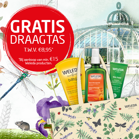 Vanaf 14 maart tem 3 april krijg je in de Tuinwinkel een mooie (gerecycleerde) katoenen draagtas cadeau bij aankoop* van Weleda producten! Met jouw aankoop haal je dus niet enkel 100% natuurlijke verzorgingsproducten in huis, maar steun je ook de biodiversiteit en de verdere opbouw en het onderhoud in onze Culinaire Tuin. Te koop in de Tuinwinkel |